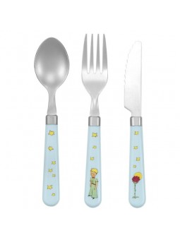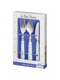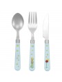 A caixa contém: uma colher, um garfo e uma faca de aço inoxidável. A faca é serrilhada, a criança pode usá-la sozinha sem correr o risco de se cortar.